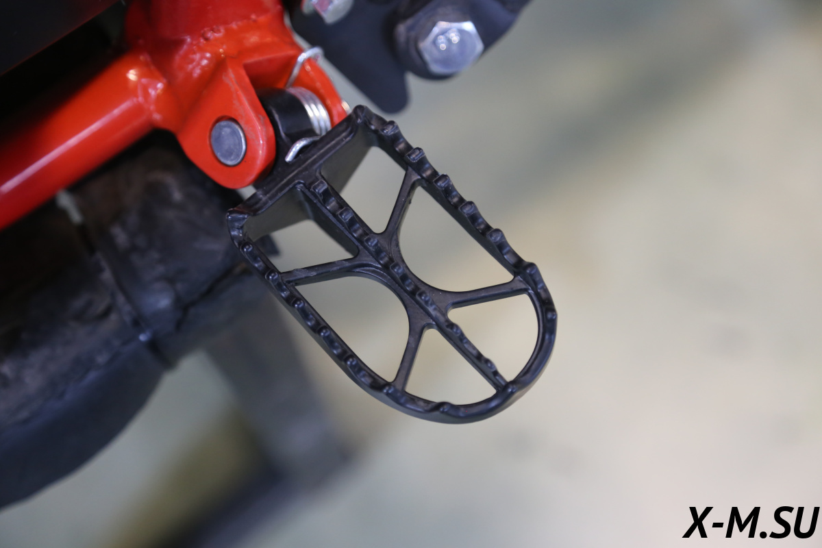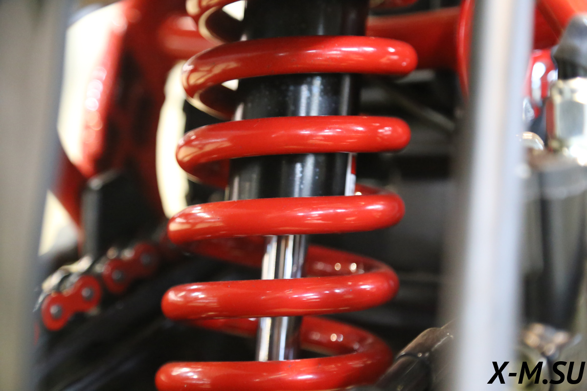 Все узлы качественно проварены, имеются дополнительные усиления. К раме специально прикреплен пластиковый каркас, который защищает мотоботы и раму. Конструкция рамы позволяет обслуживать мотоцикл, регулировать зазоры клапанов и заменять свечи, не снимая двигатель. Задний рычаг изготовлен из авиационного алюминия, что придает высокую жесткость на скручивание.