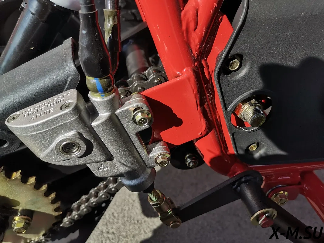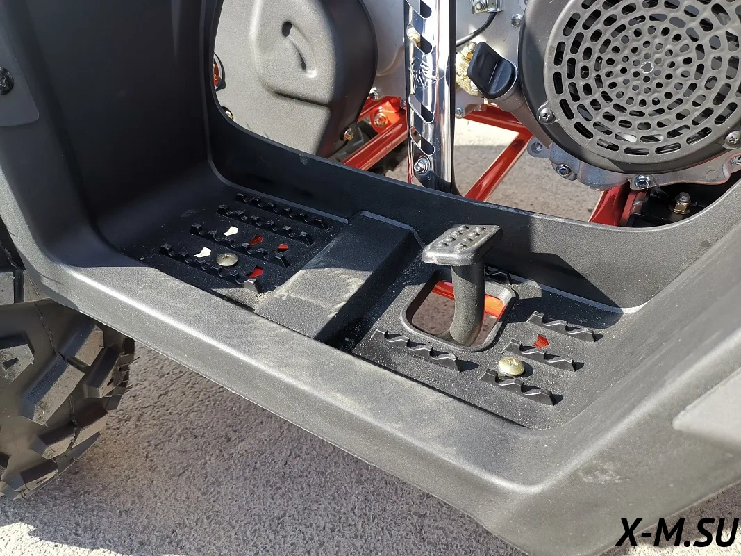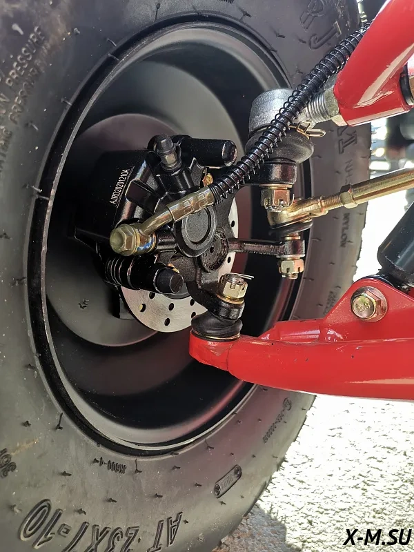 Гидравлическая тормозная система, замкнутая в общий контур, который равномерно распределяет нагрузку на все колёса, с вентилируемыми тормозными дисками Nippon (Hitachi) отвечают за эффективное торможение. Регулировка хода курка газа – если вы учите своего ребенка общению с техникой.
