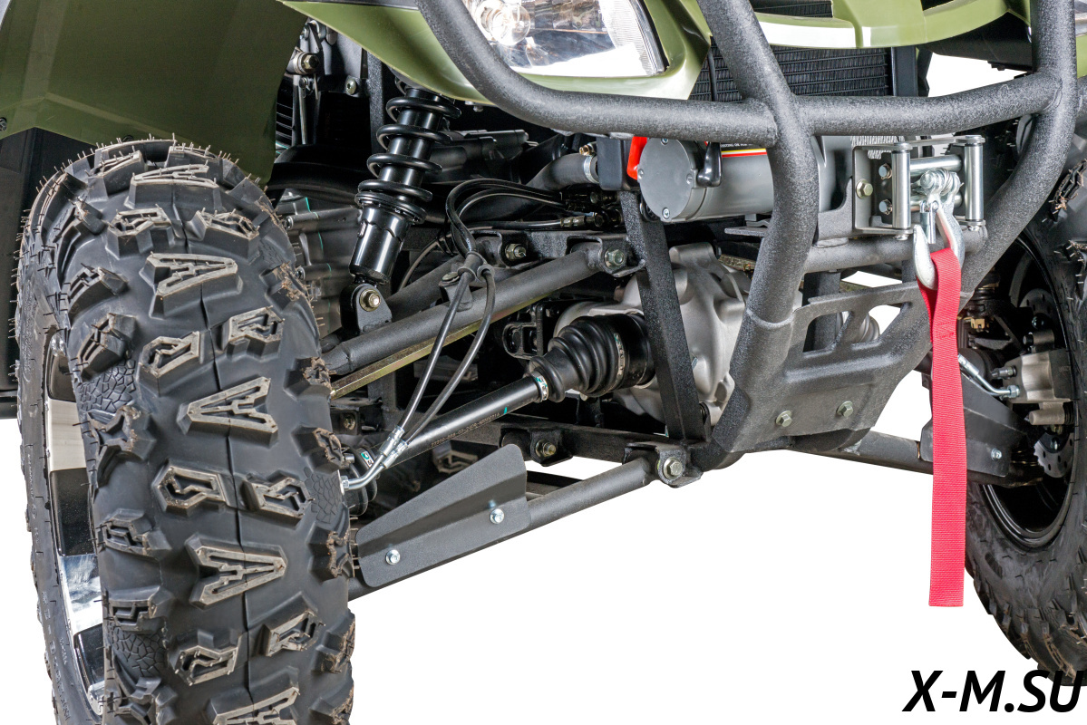 Подключаемый полный привод с блокировкой дифференциала значительно улучшает проходимость квадроцикла и его управляемость на сложных участках дороги, позволяя эффективно распределять крутящий момент между осями и предотвращать занос.
